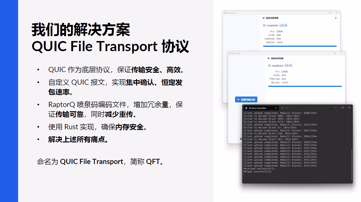 没有办法,最后搓出来了 QUIC File Transport,基于 QUIC 和 RaptorQ 编码的乱七八糟的东西。。最后成功证明了顺序分块、丢包重传就是最佳的解决方案(逃